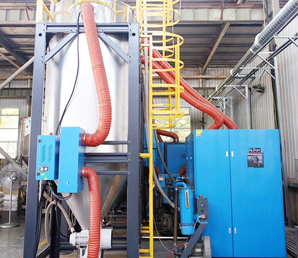 集中供料系統(tǒng)采用一臺機(jī)一根管,密封式回路設(shè)計(jì)方式,保證整個(gè)系統(tǒng)運(yùn)行穩(wěn)定,絕無塑膠回潮、堵料現(xiàn)象發(fā)生。它配合干燥機(jī)(除濕機(jī))系統(tǒng)使用,可使干燥空氣對原料進(jìn)行再次干燥,防止干燥后的塑膠回潮,同時(shí)在每個(gè)輸送循環(huán)后對輸送管進(jìn)行清理,確保管道內(nèi)沒有殘料。在避免原料回潮的同時(shí)也保證加入設(shè)備中原料一致性,在真空負(fù)壓同進(jìn)作用下,原料中原有的粉塵經(jīng)過過濾器(集塵器)系統(tǒng)濾出,有利提高產(chǎn)量。
